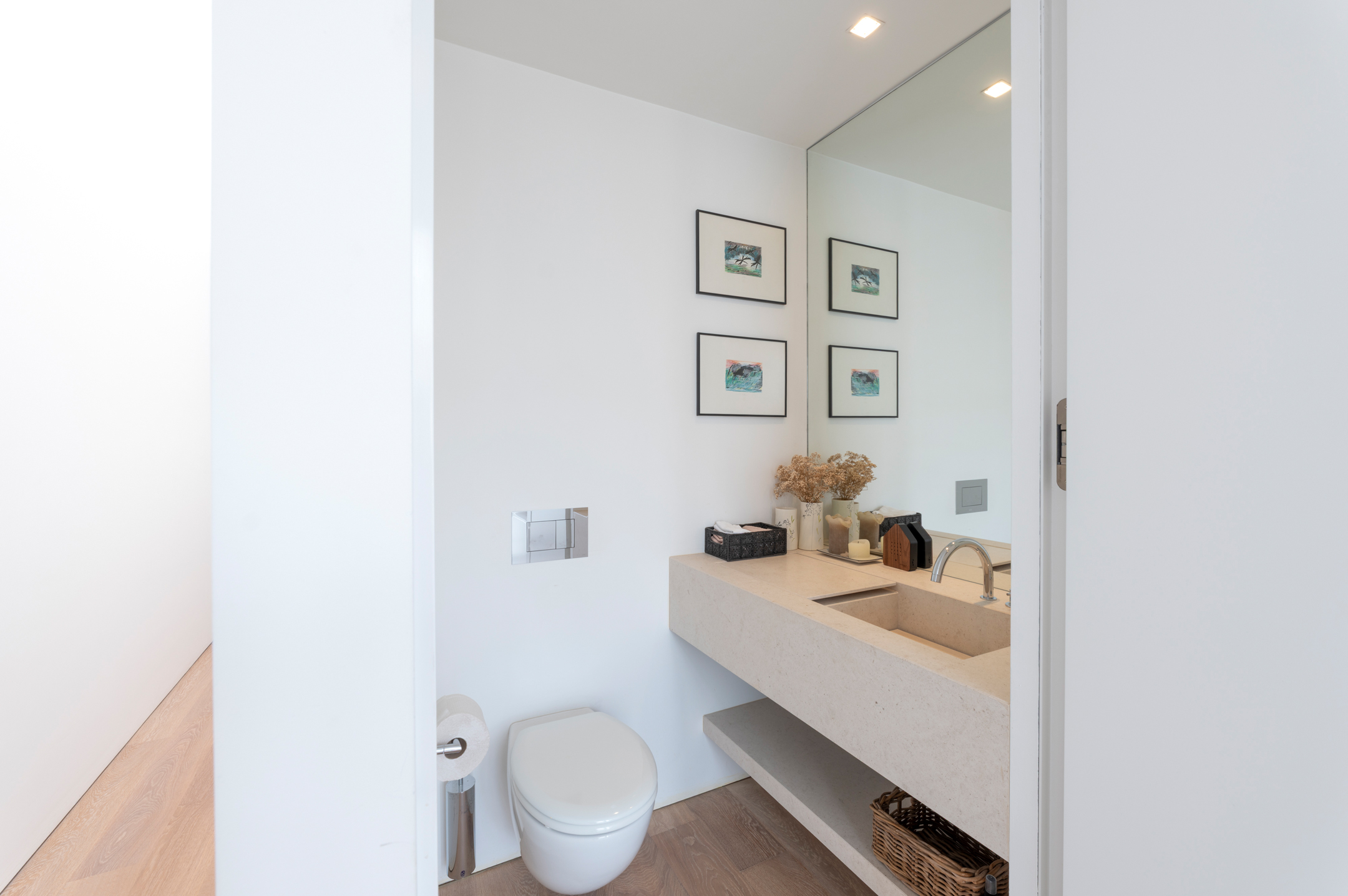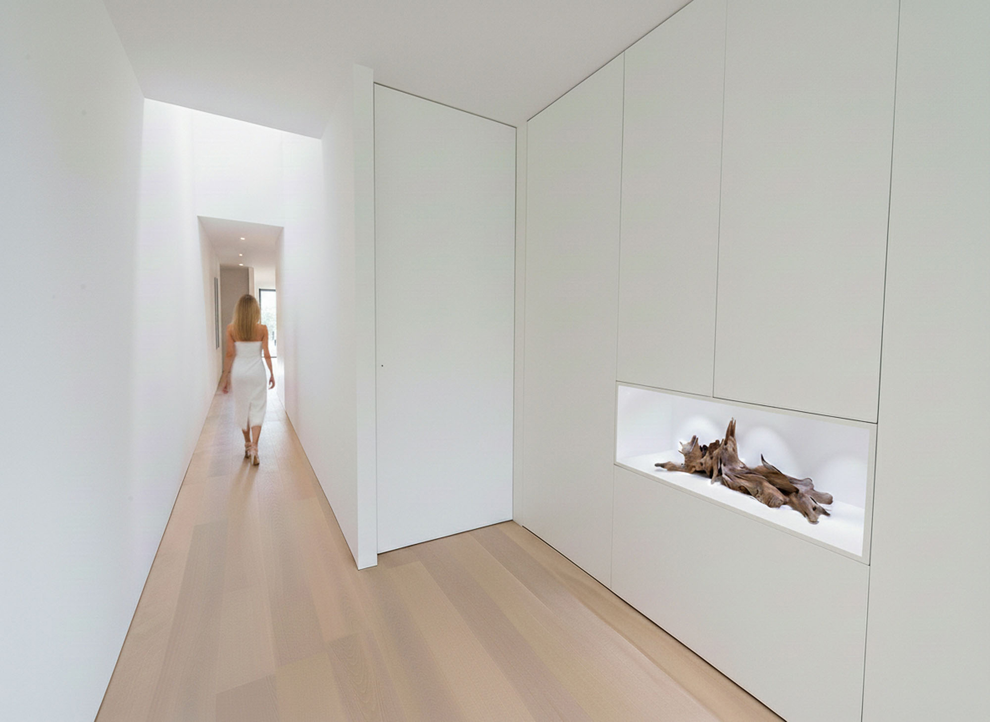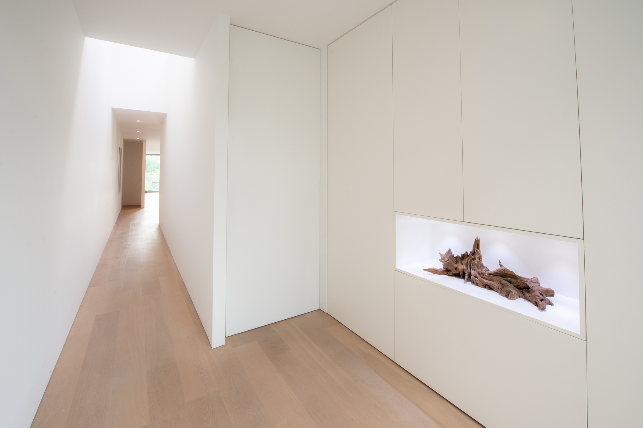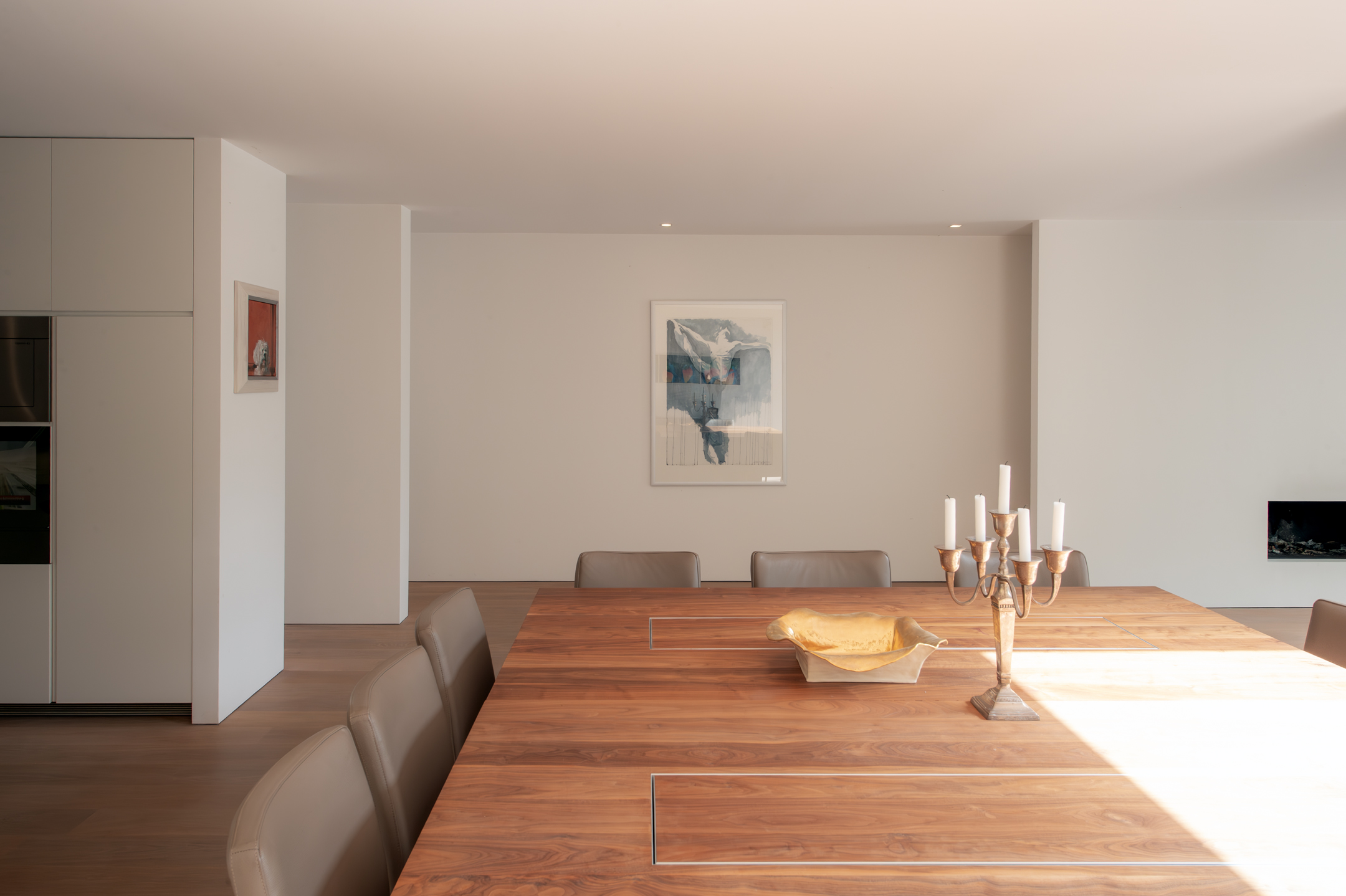 The floors are laid in French oak, selected without knots for a calm, continuous grain. The planks run the full length of each room and disappear beneath the floating walls. Underfloor heating runs beneath the entire surface, controllable remotely.