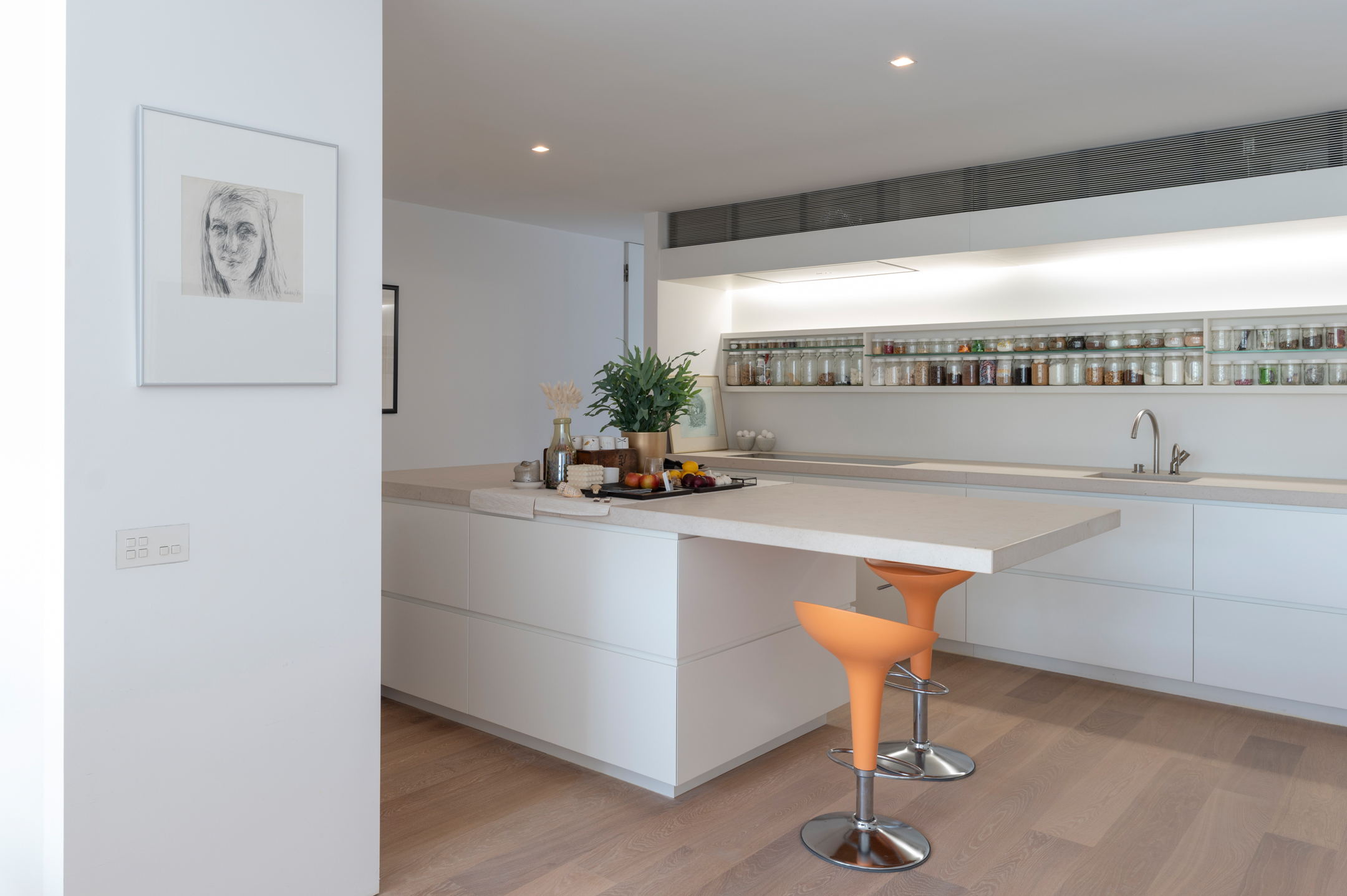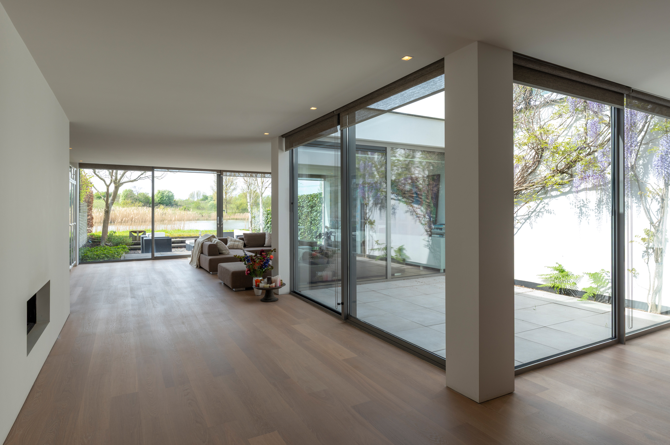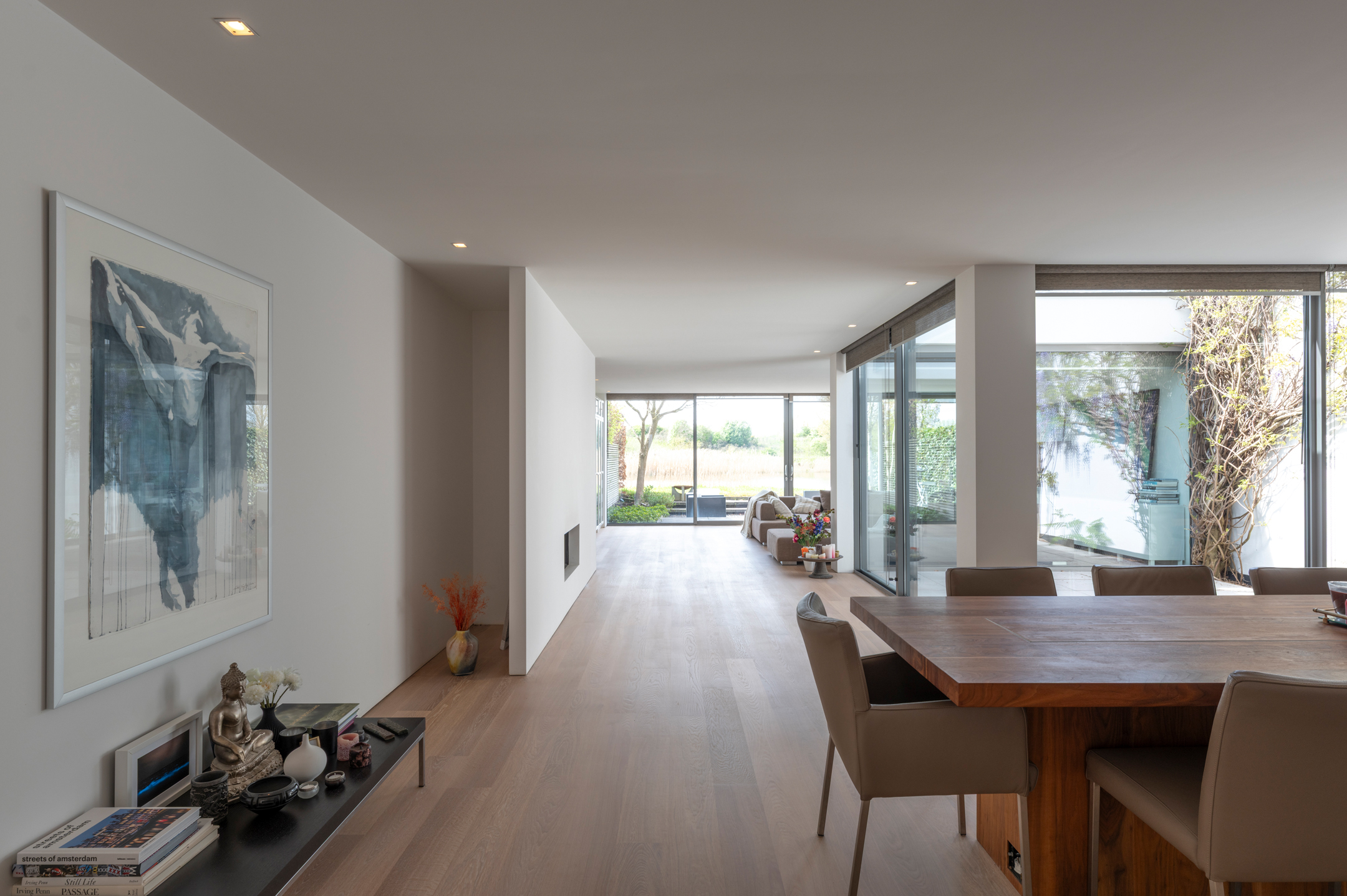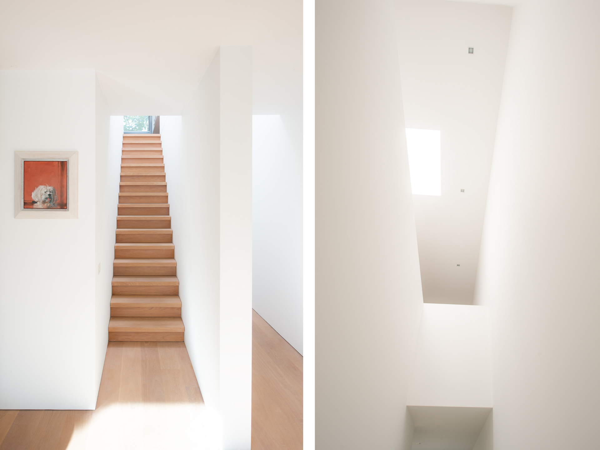 The floors are laid in French oak, selected without knots for a calm, continuous grain. The planks run the full length of each room and disappear beneath the floating walls. Underfloor heating runs beneath the entire surface, controllable remotely.