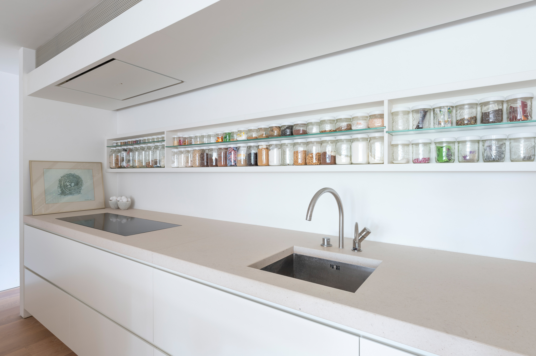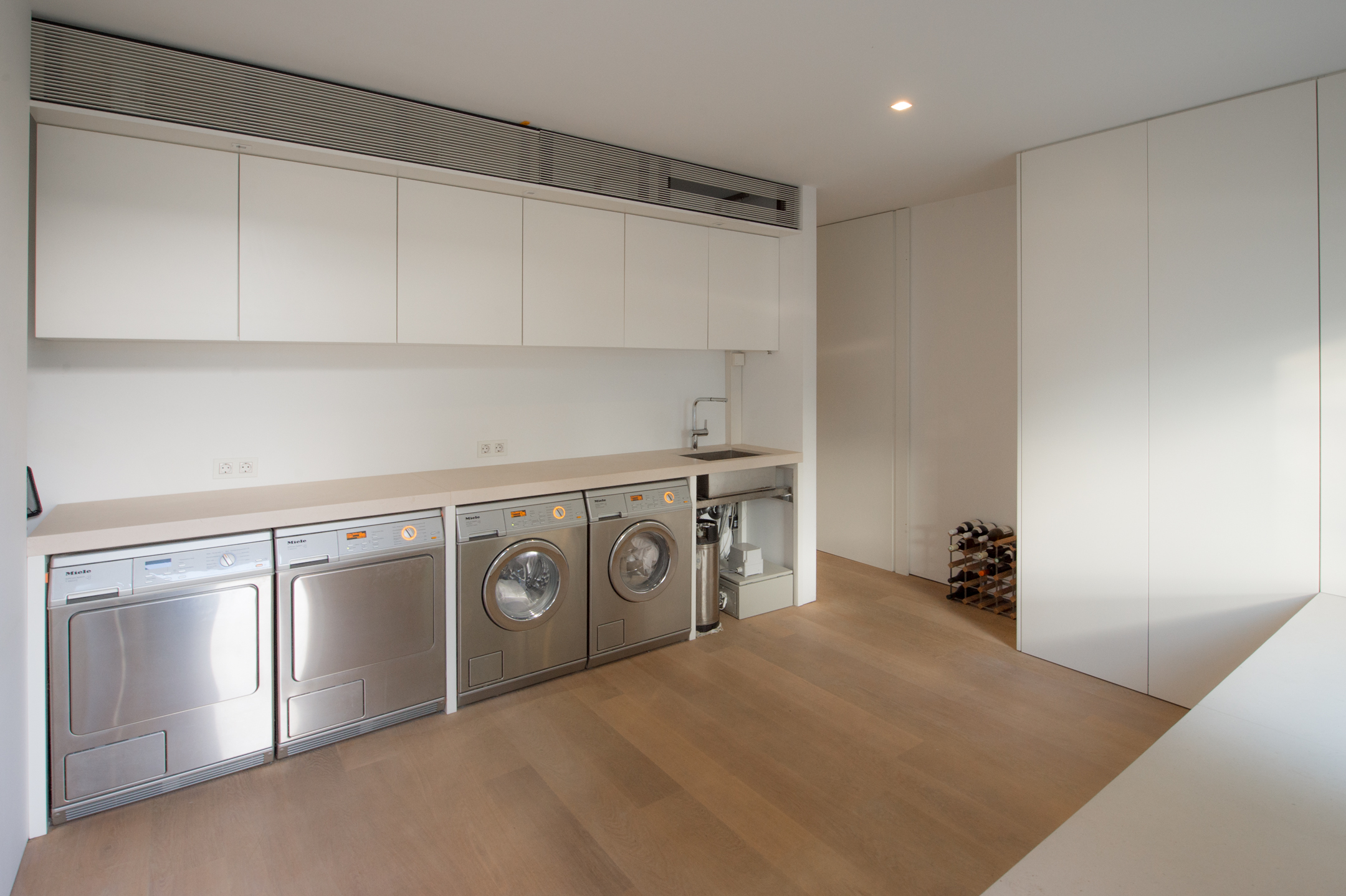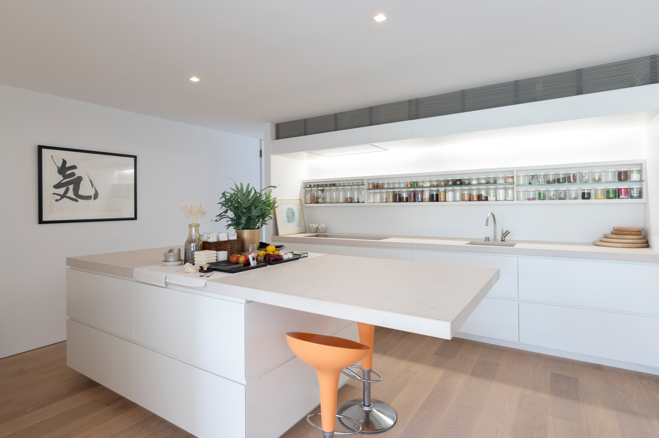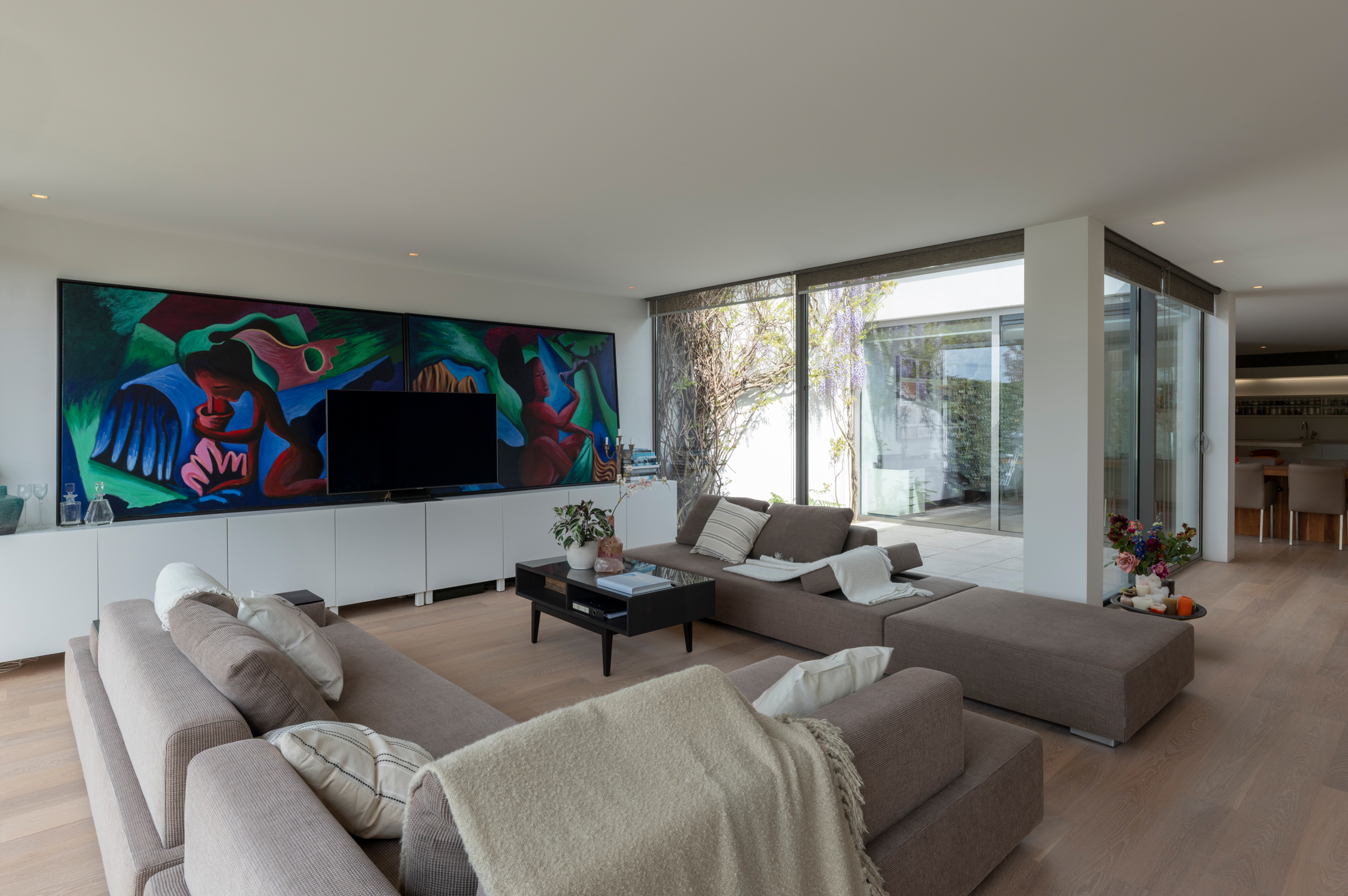The floors are laid in French oak, selected without knots for a calm, continuous grain. The planks run the full length of each room and disappear beneath the floating walls. Underfloor heating runs beneath the entire surface, controllable remotely.