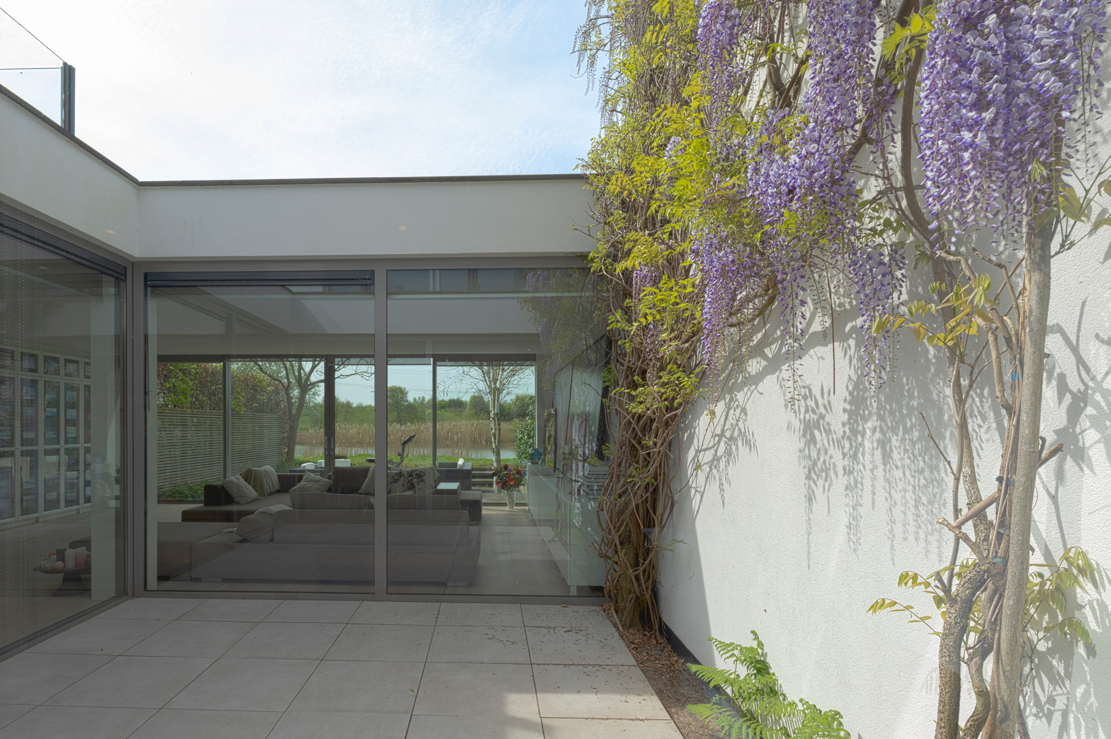 All bathrooms, the kitchen, bijkeuken and toilet are finished in sweetened Moleanos, a Portuguese limestone valued for its calm, warm tone and refined grain. Sweetening removes the surface tension of the stone, creating a silky finish that is both durable and tactile.