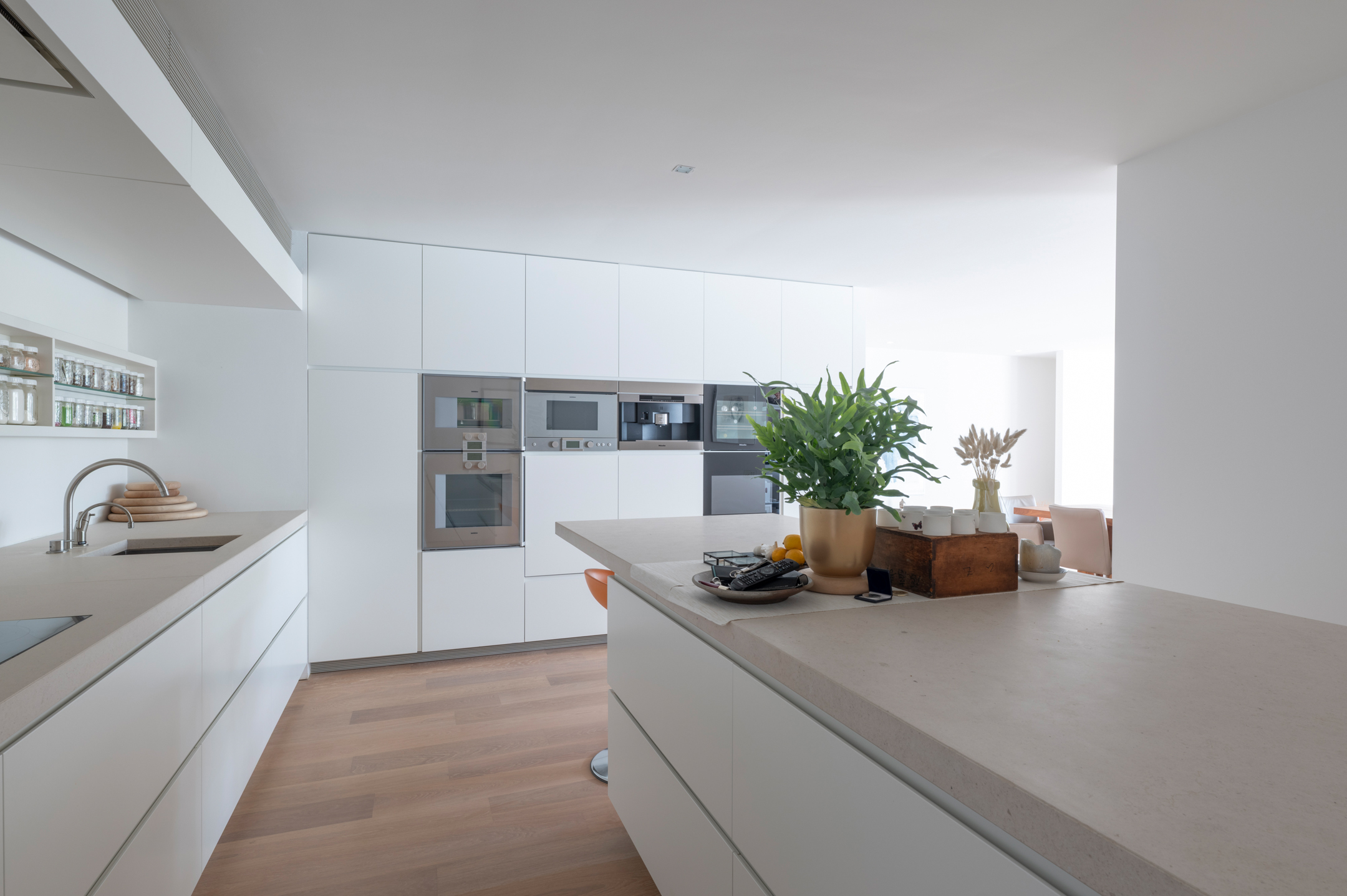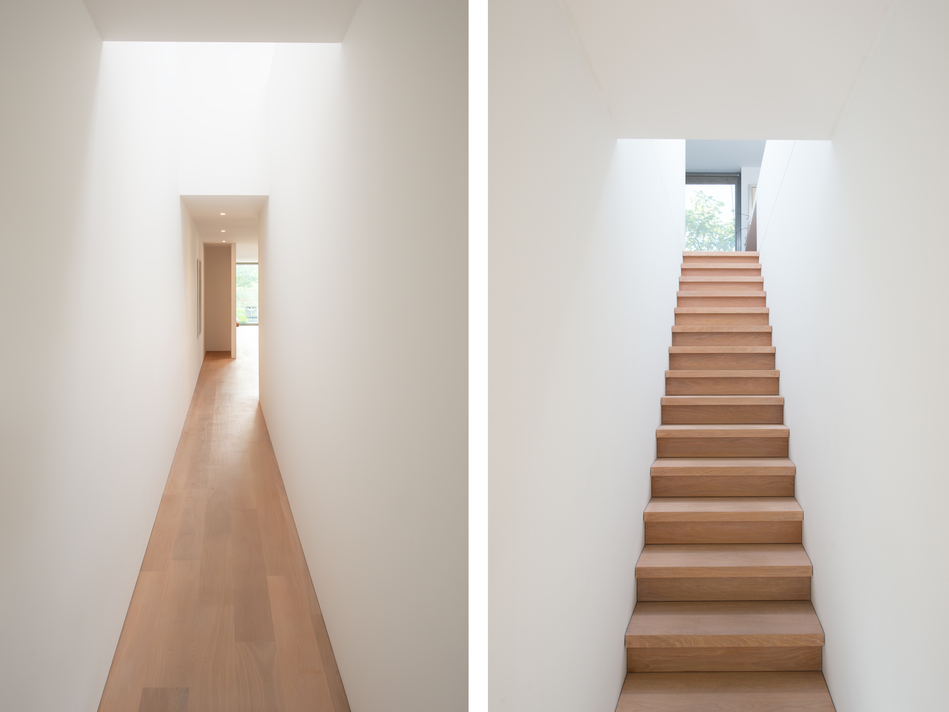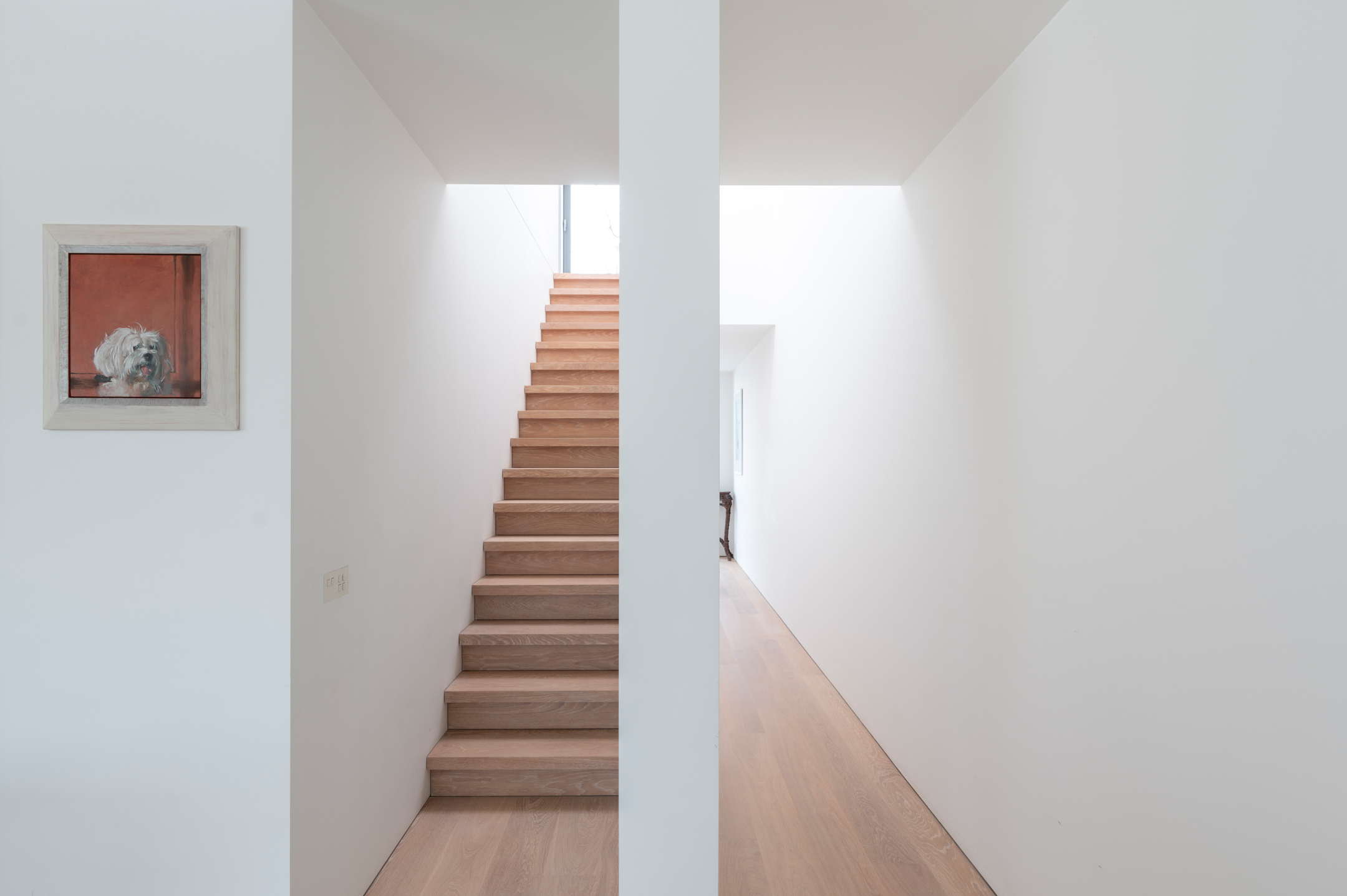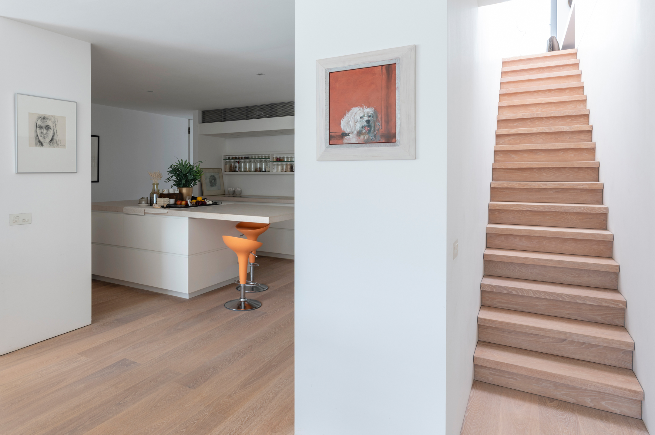 The floors are laid in French oak, selected without knots for a calm, continuous grain. The planks run the full length of each room and disappear beneath the floating walls. Underfloor heating runs beneath the entire surface, controllable remotely.