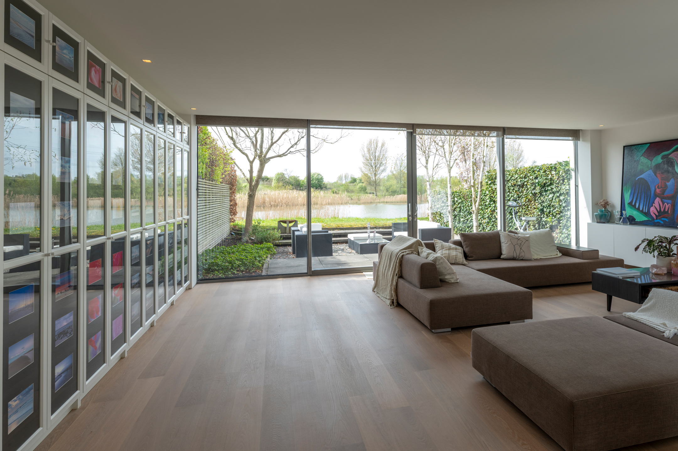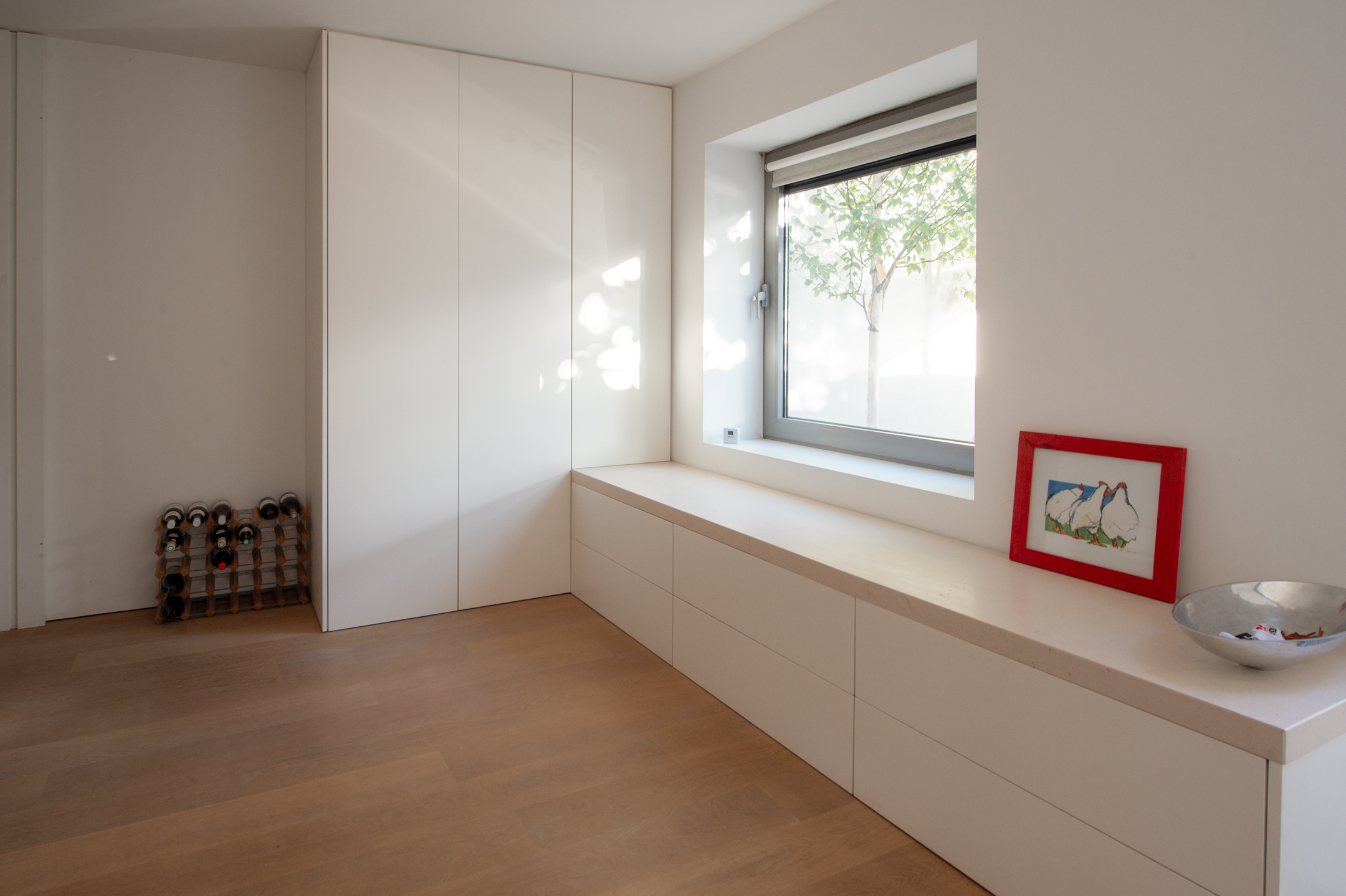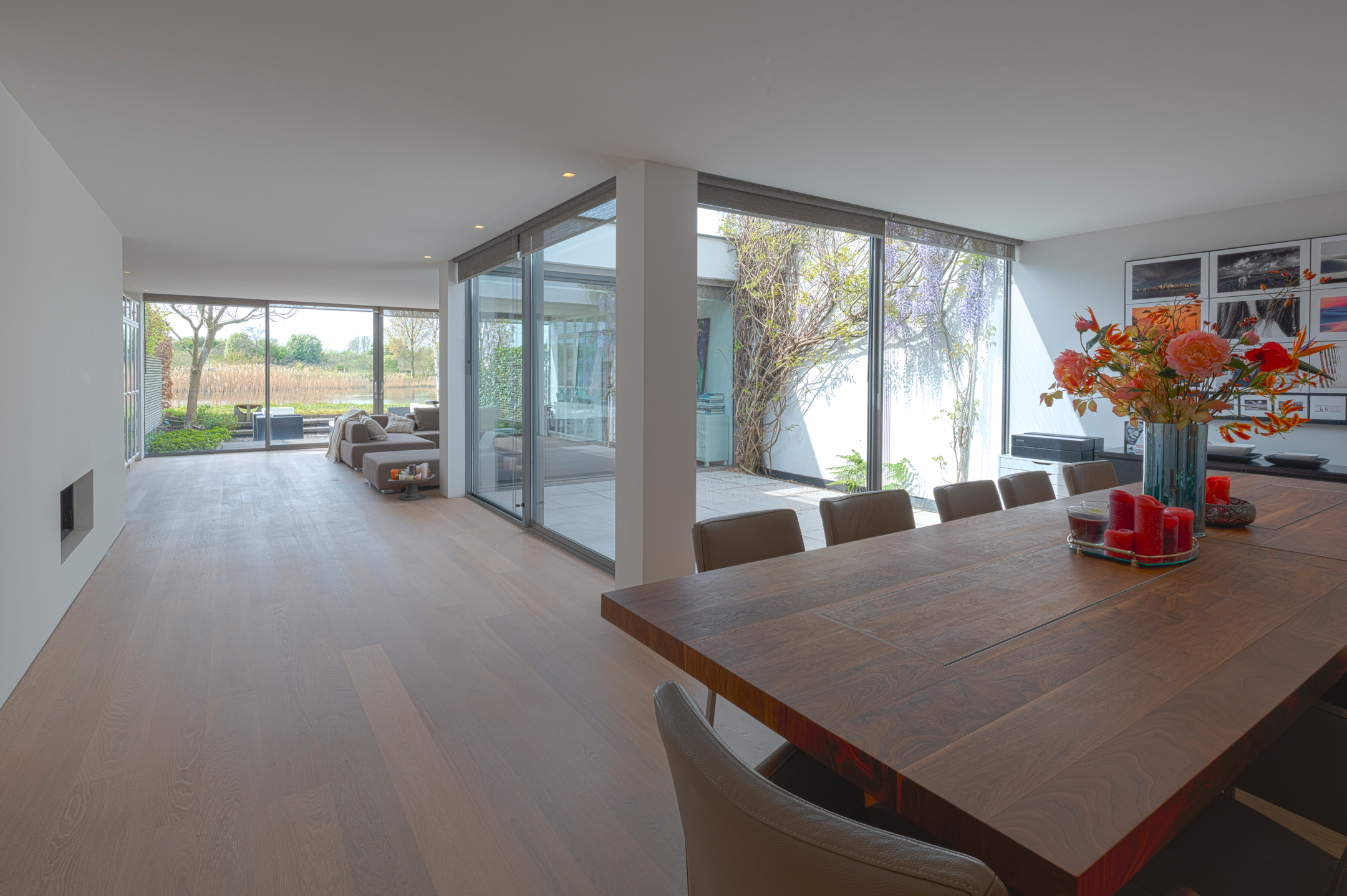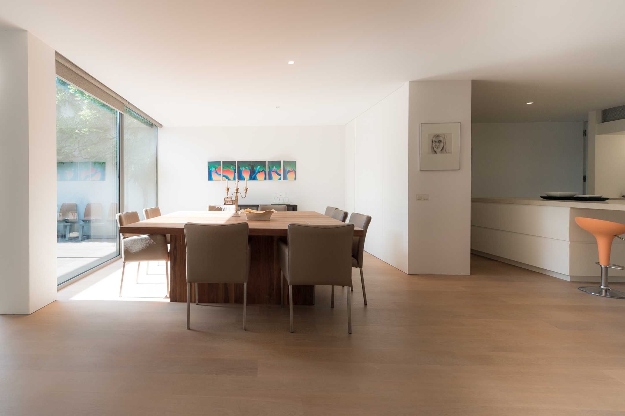 The floors are laid in French oak, selected without knots for a calm, continuous grain. The planks run the full length of each room and disappear beneath the floating walls. Underfloor heating runs beneath the entire surface, controllable remotely.