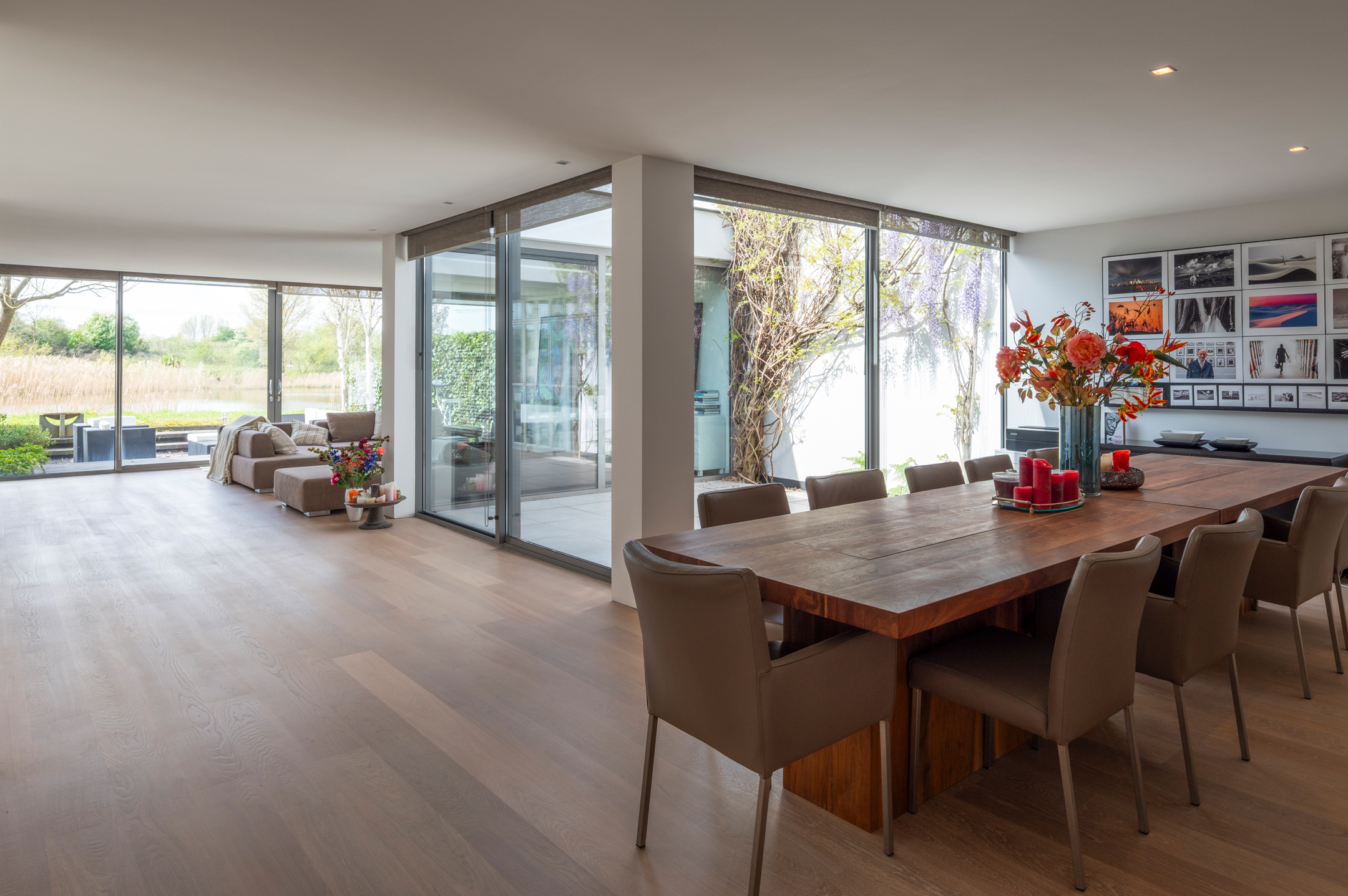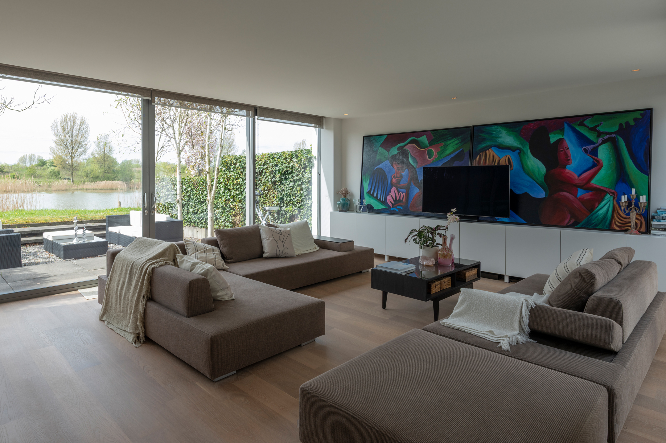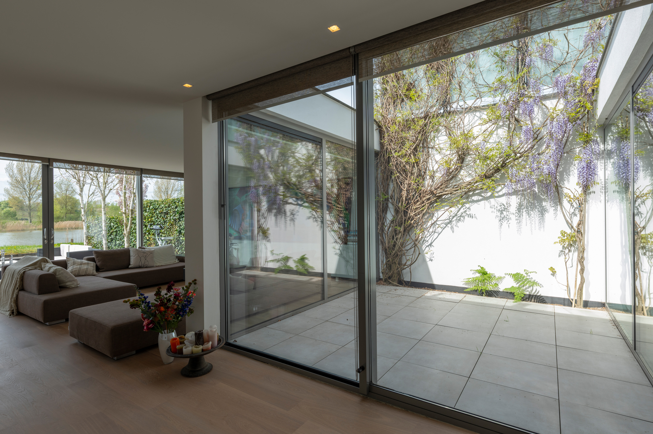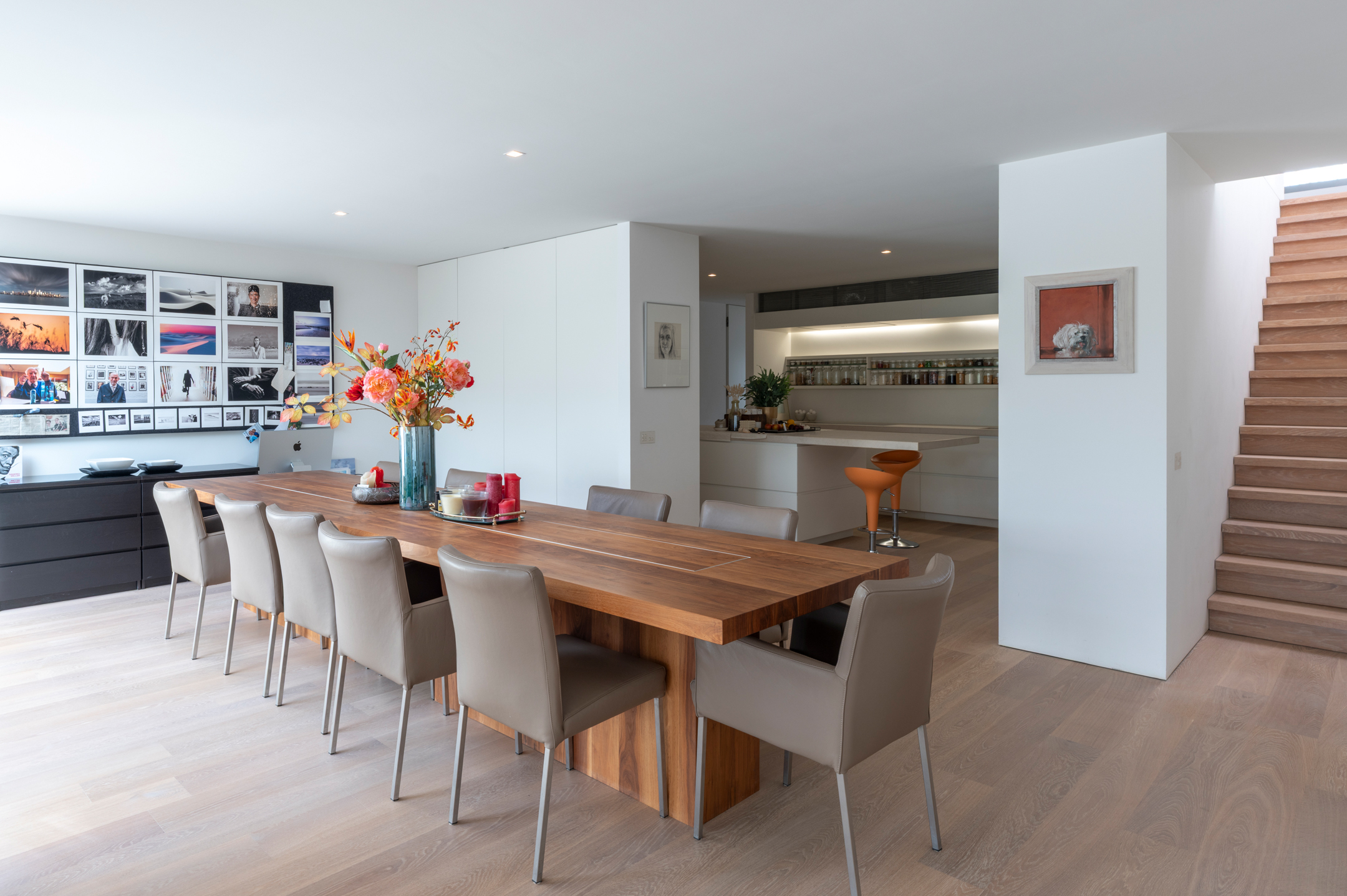 The floors are laid in French oak, selected without knots for a calm, continuous grain. The planks run the full length of each room and disappear beneath the floating walls. Underfloor heating runs beneath the entire surface, controllable remotely.
