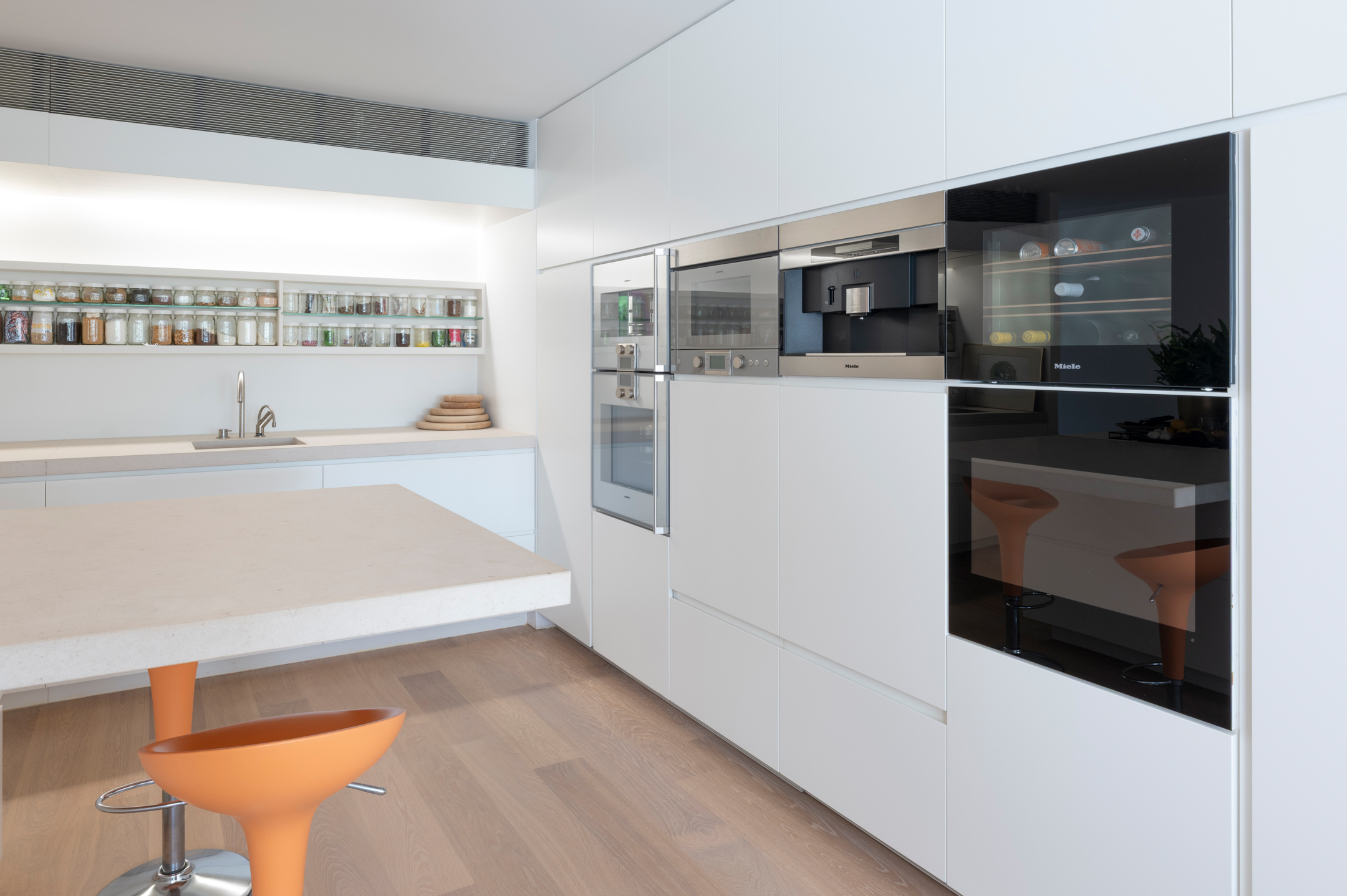 Bespoke kitchen with natural stone island, steam oven, wine climate cabinet, extra-wide induction hob and integrated television.